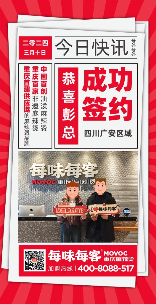 感谢彭总信任 成功签约【四川广安】区域门店 每味每客·重庆麻辣烫 中国首创油泼麻辣烫 重庆首家非遗麻辣烫 重庆首建供应链的麻辣烫品牌