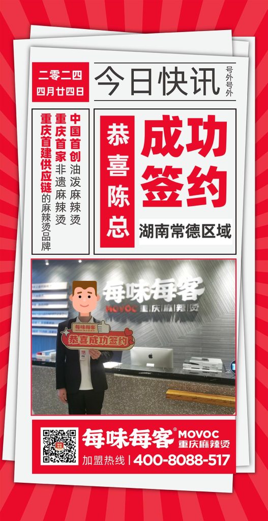感谢陈总信任,成功签约【 湖南常德 】区域门店 每味每客·重庆麻辣烫 中国首创油泼麻辣烫 重庆首家非遗麻辣烫 重庆首建供应链的麻辣烫品牌